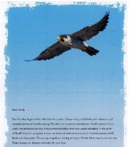 James Geoffrey “Geoff” Monk was a dedicated biologist who spent the first 18 years of his career saving the peregrine falcon from extinction. Geoff’s work with the Canadian Fish and Wildlife Service, U.S. Bureau of Land Management, the U.S. Fish and Wildlife Service, and the Santa Cruz Predatory Bird Research Group, along with his Master’s Thesis research on the effects of DDT on peregrine falcon individuals, directly contributed to saving and restoring the peregrine falcon population in California.
